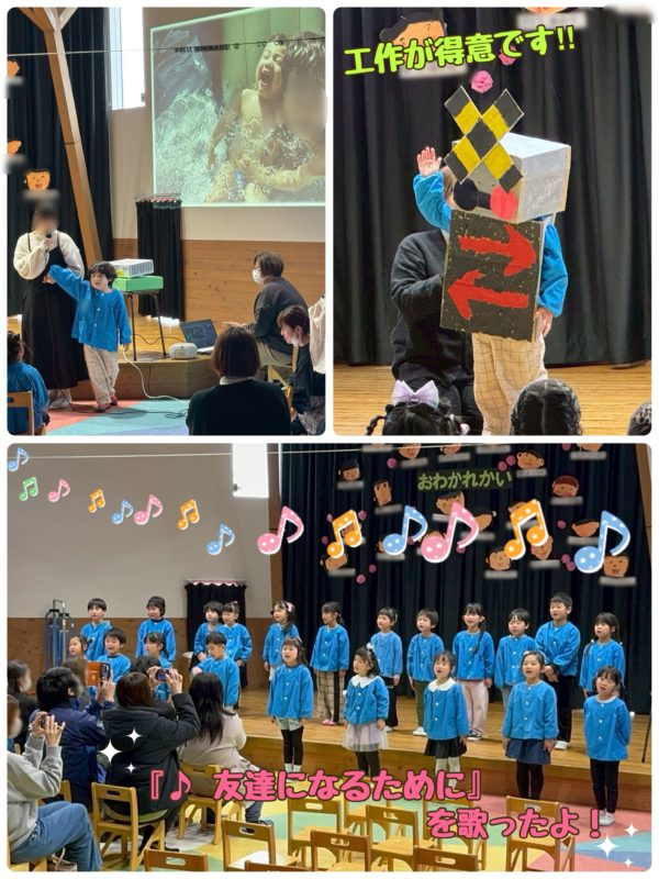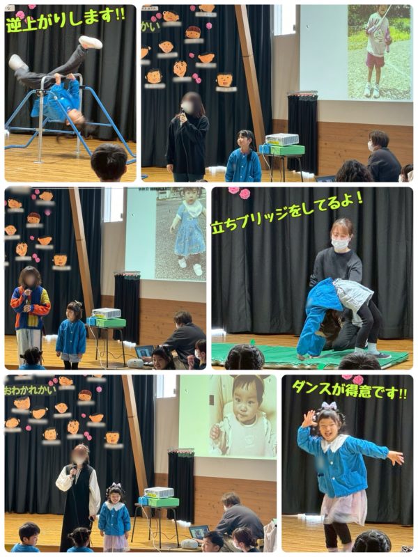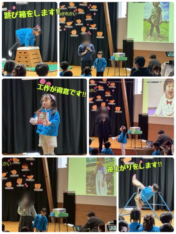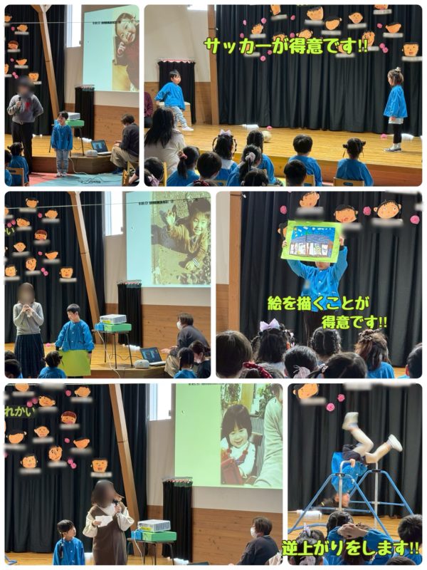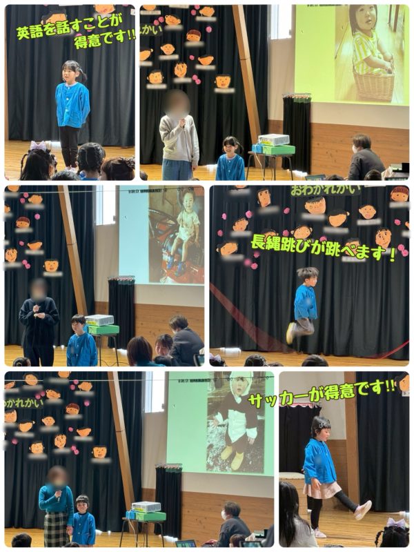 お家の方には…前に出てお子さんの小さかった頃の話などをしていただきました。また、子ども達からは、できるようになったことや、得意なこと発表、小学校に行って頑張りたいことやお家の方々へのメッセージ等を発表しました。