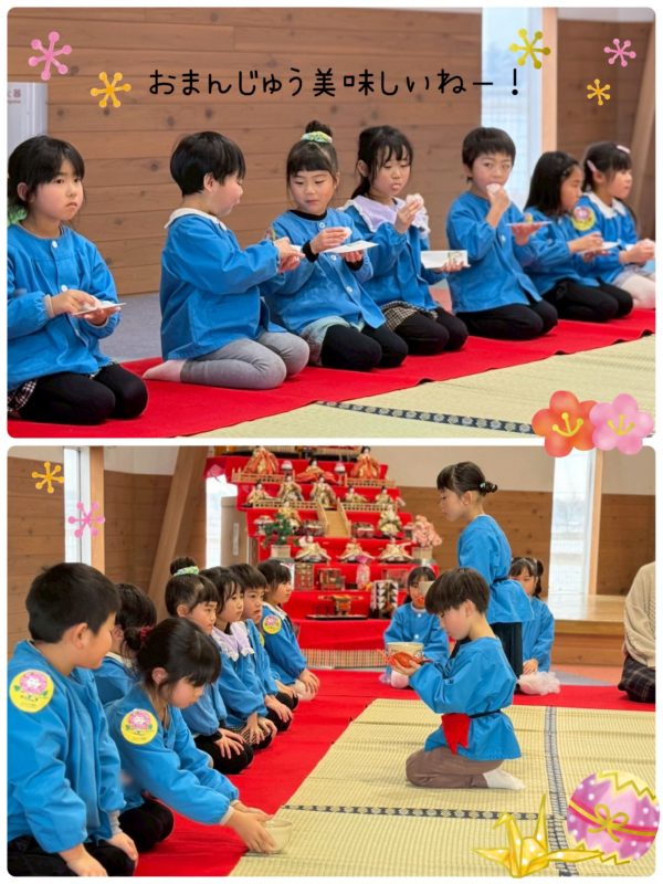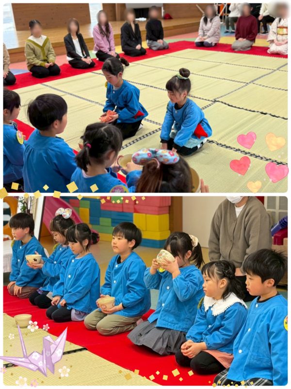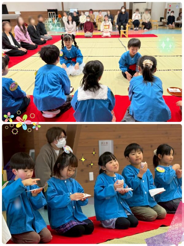 うめ組の子ども達は、ただお菓子やお茶をいただくのではなく、お茶の作法にのっとった言葉遣いや所作を行い、お茶会の雰囲気を楽しみました。