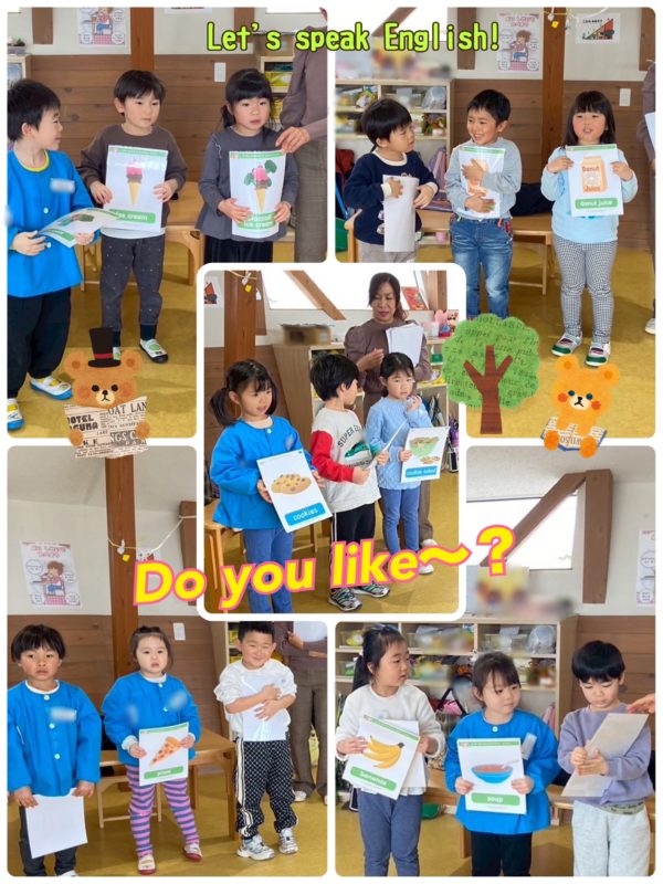 「英語で遊ぼう!」は、うめ・さくら組を対象に月に一度行われています。今月は…もも組さんも体験レッスンをさせてもらいました。