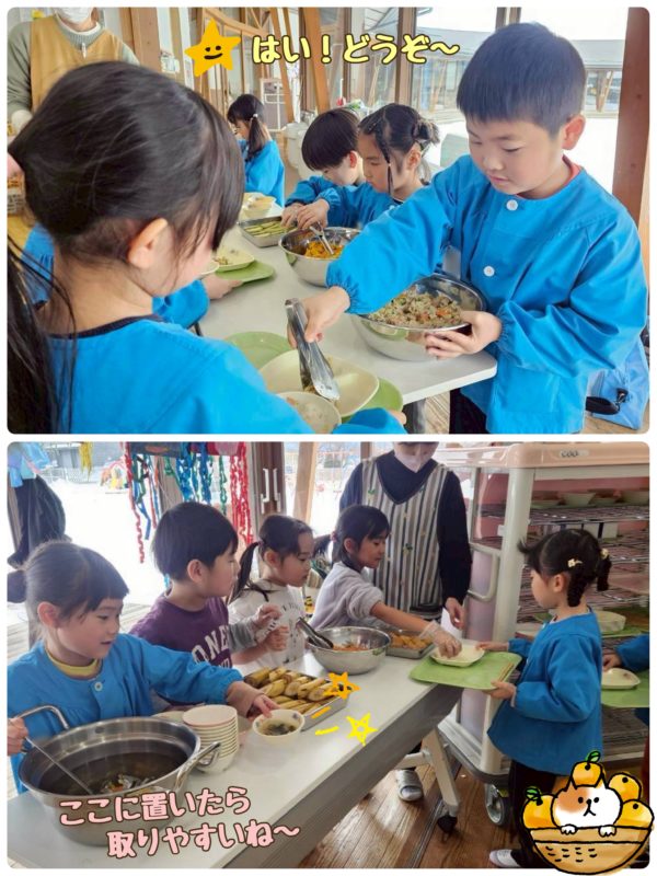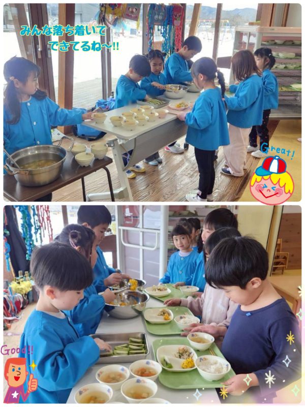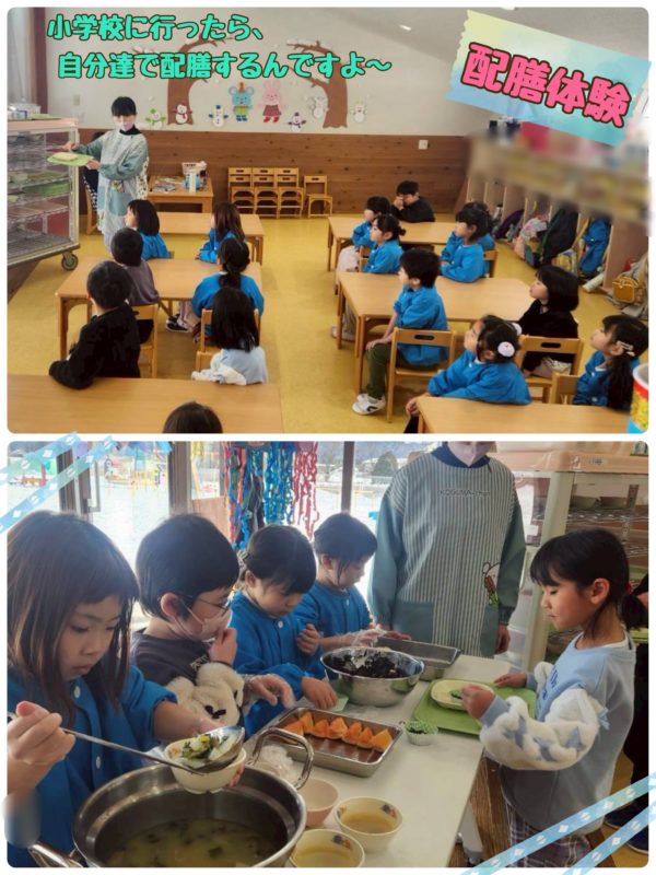 4月に一年生になるさくら組の子ども達が、給食の配膳体験を行っています。