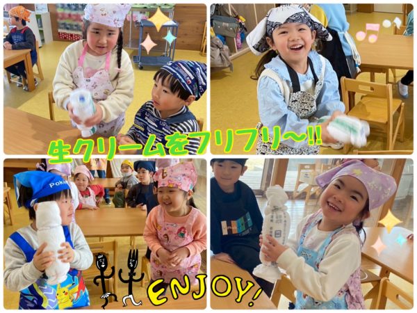 意外と体力を使うのですが、子ども達は「楽しい〜!」と最後まで生クリームを振り続けることができました。