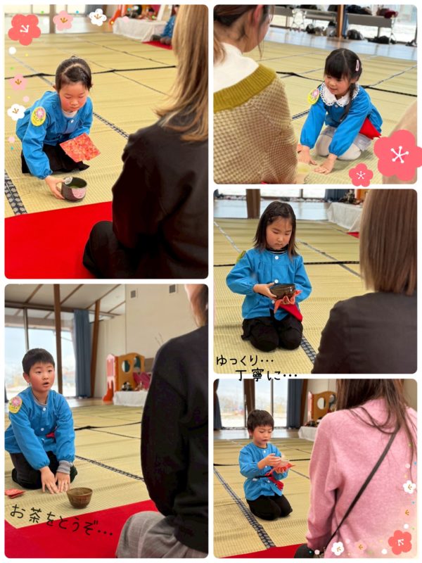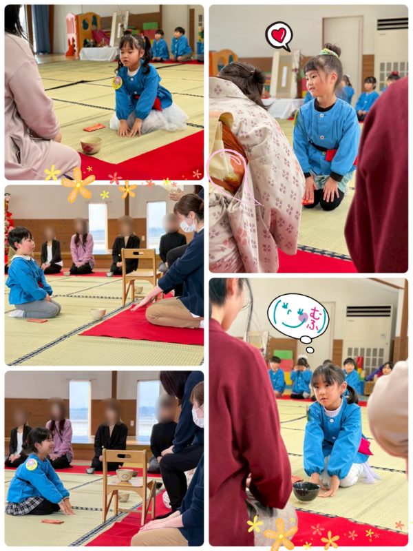 うめ組の子ども達は、ただお菓子やお茶をいただくのではなく、お茶の作法にのっとった言葉遣いや所作を行い、お茶会の雰囲気を楽しみました。