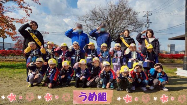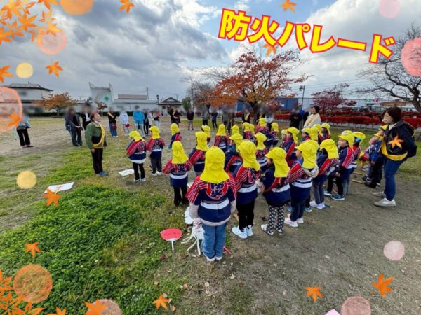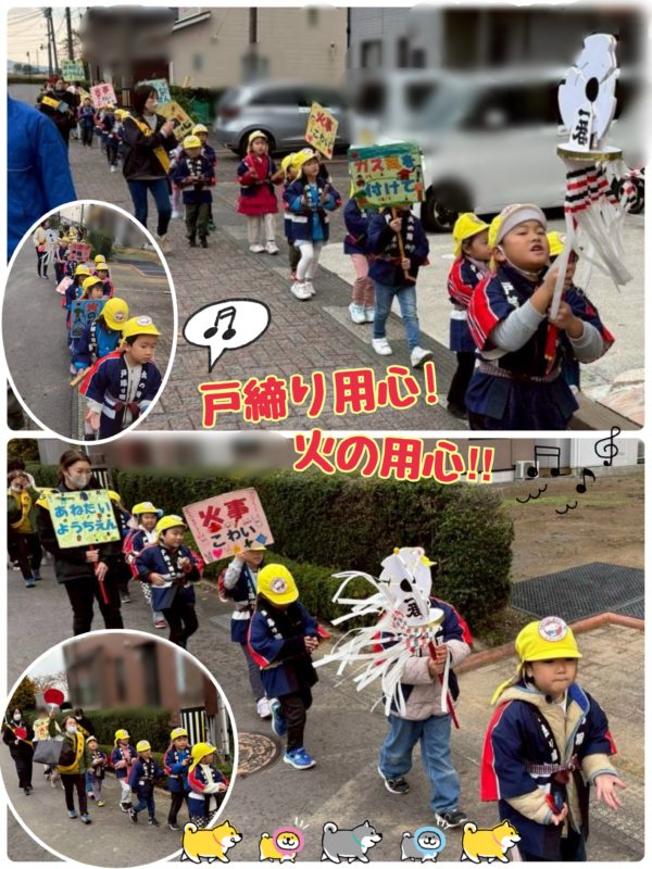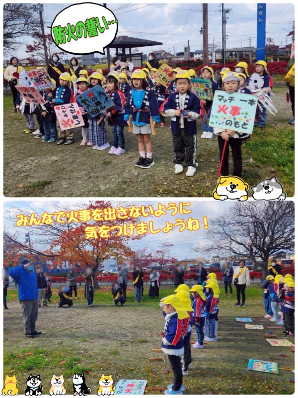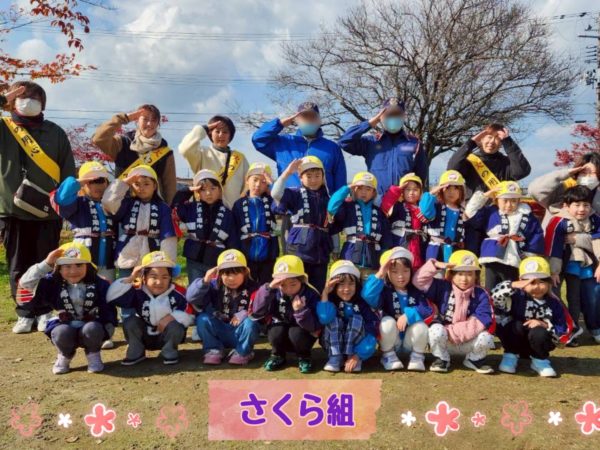 うめ・さくら組の子ども達が幼年消防隊になって上姉体地区を歩き、火災予防を呼びかけました。
