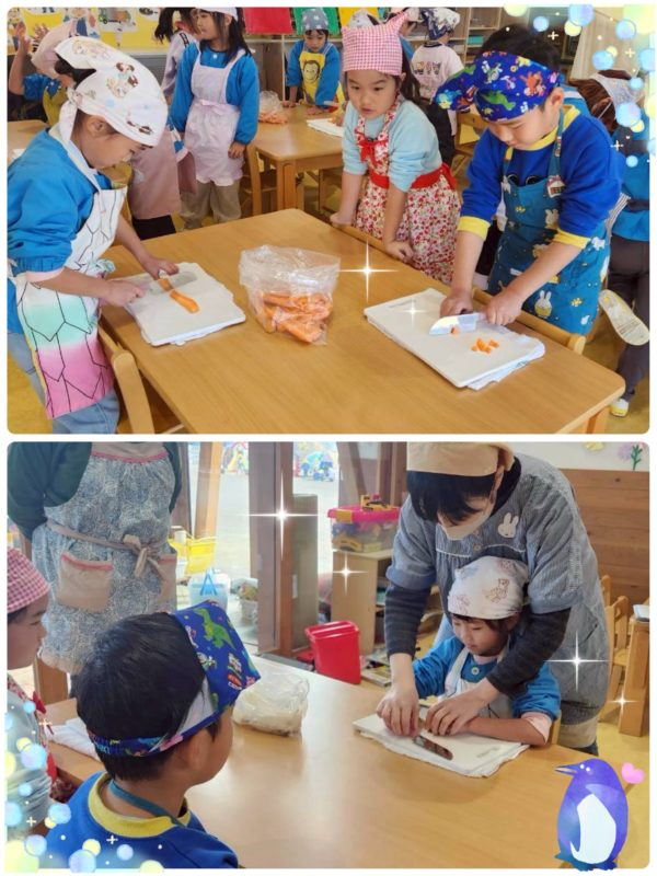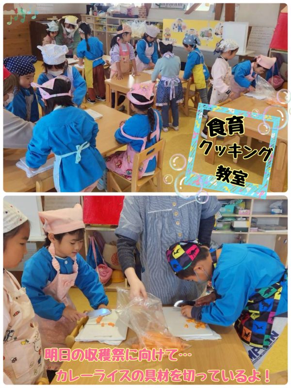 毎月一回さくら組で行われている食育クッキング教室。今回は…明日の収穫祭にみんなで食べるカレーライスの材料を切ります!