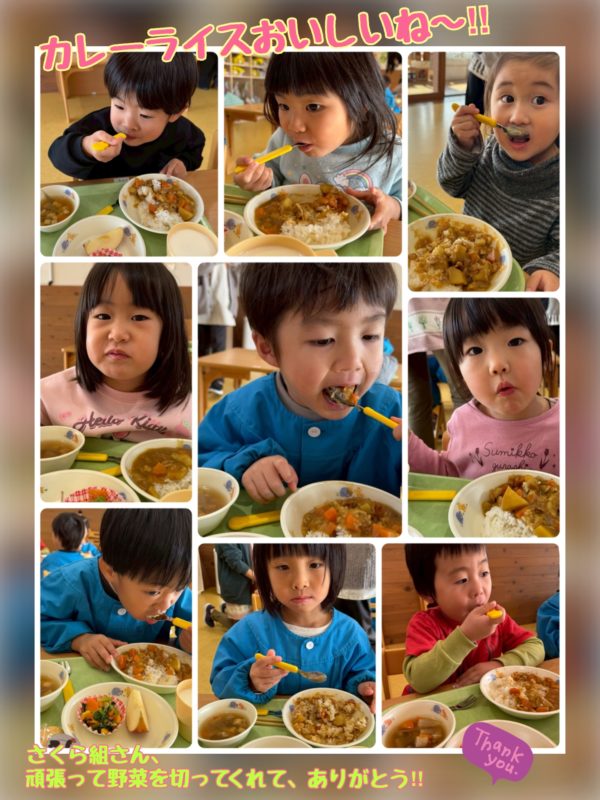 さくら組さんが切ってくれた野菜がたくさん入っていたよ〜!