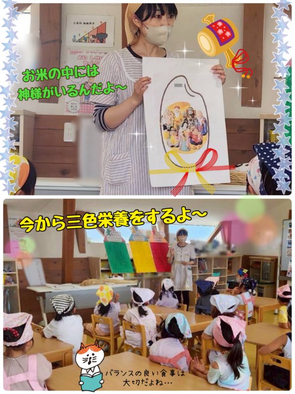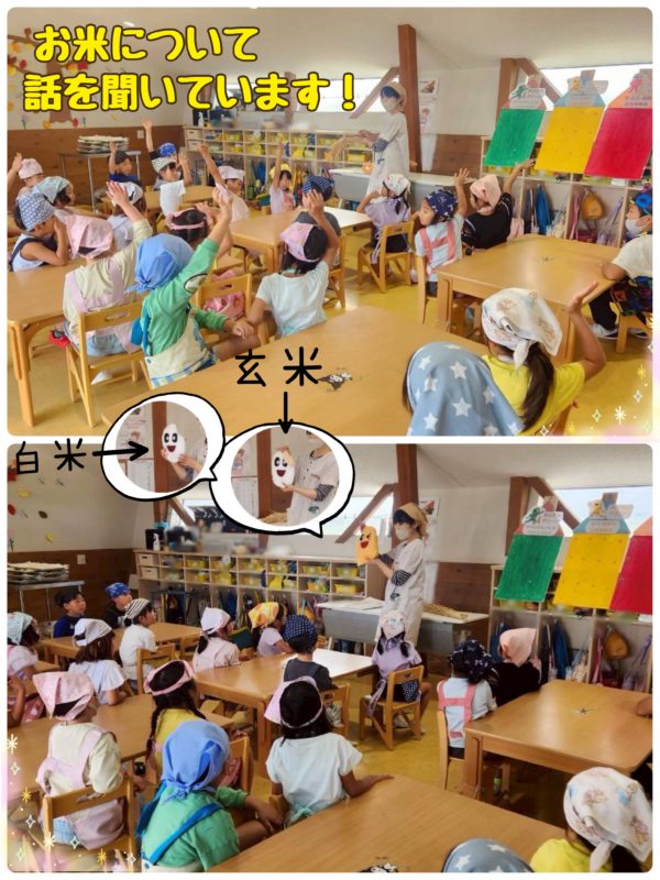 クッキーの型抜きの後は、お米について話を聞きました。(新米の時期ですからね〜)