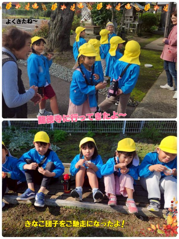 新山神社で七五三のお宮参りをすませた子ども達…。龍徳寺でちょっぴり休憩をした後、姉体地区センターに行きました。