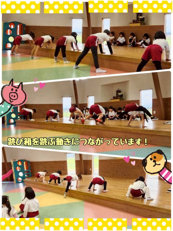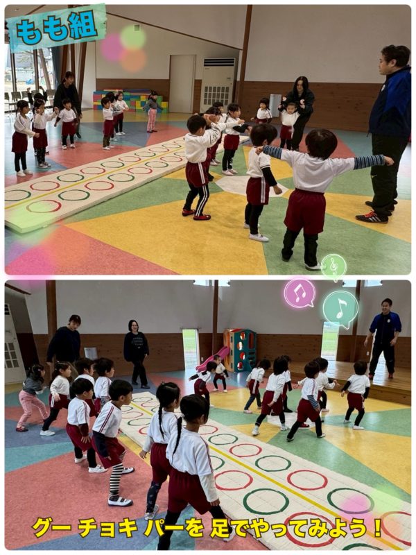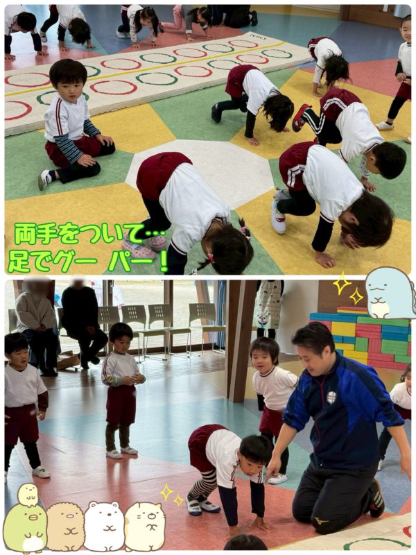 ※毎回保護者の方に聞かれるので、先にお教えしますが、写真の左側に写っているのが、前・園長先生の奥様で、大ベテランのおばあちゃん先生です。何十年も現役幼稚園教諭として姉体幼稚園に勤めておられた方なんですよ〜。…ってことは、現・園長先生のお母さんということですね〜!
