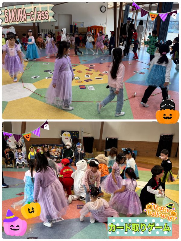 ハロウィンにちなんだ英単語を教えてもらった後は、クラスごとにカード取りゲームをしました。